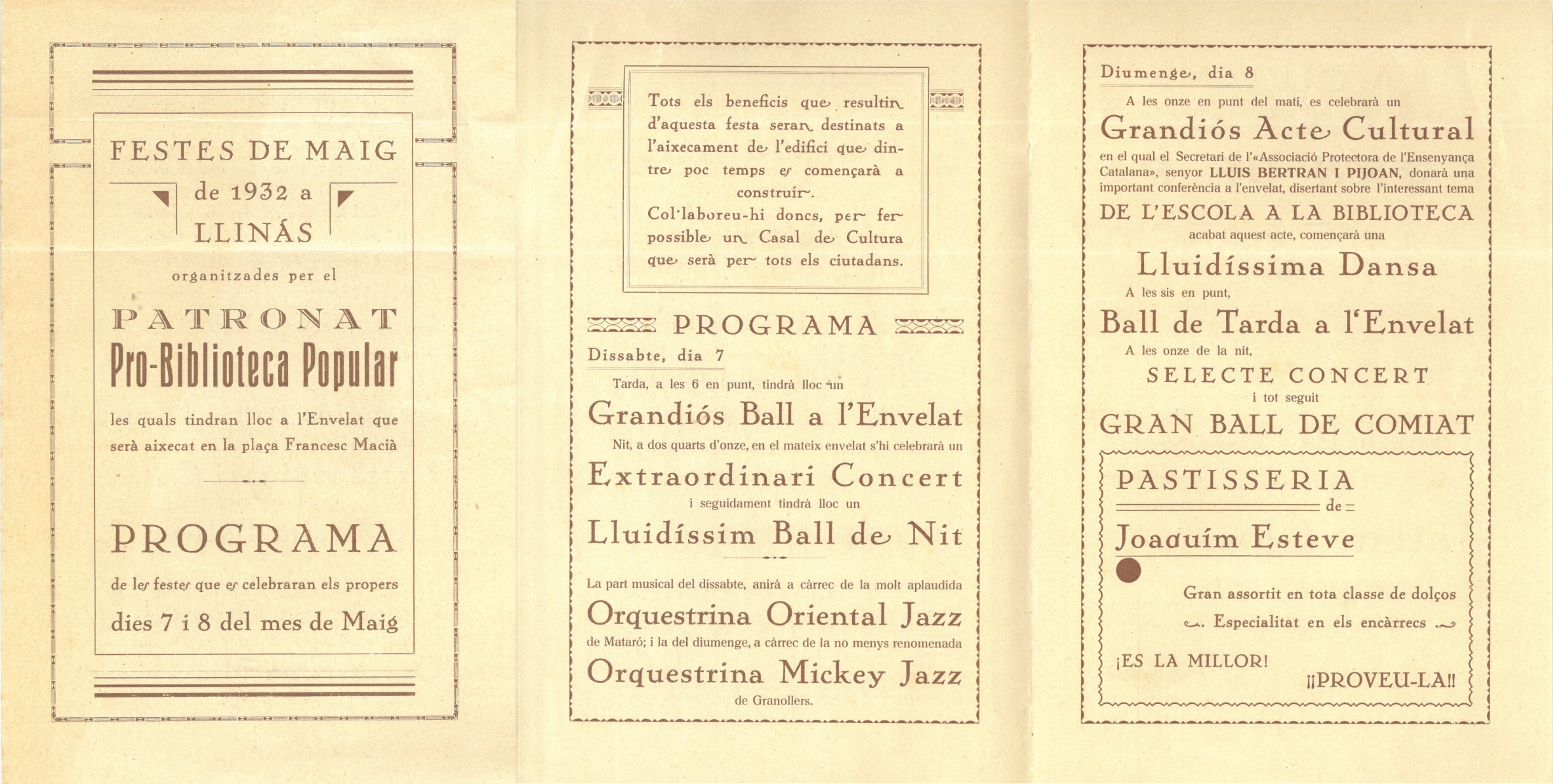 A inicis dels anys trenta, l’Ajuntament disposava d’un terreny cedit pels propietaris del Castell Nou per aixecar la Biblioteca Popular, situada a l’avinguda Mas Bagà. L’arquitecte municipal va elaborar els plànols i el Patronat Pro Biblioteca Popular va promoure una campanya de recollida de fons amb el díptic “Pel poble i estiuejants”, a més de destinar els beneficis de les Festes de Maig al projecte.