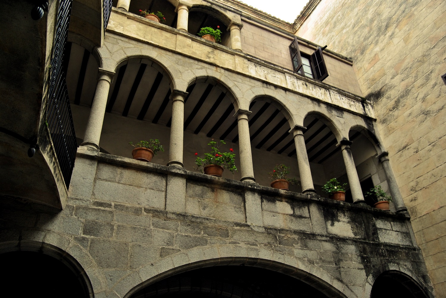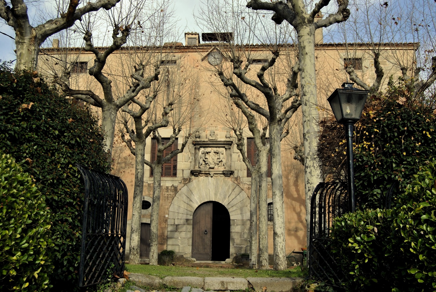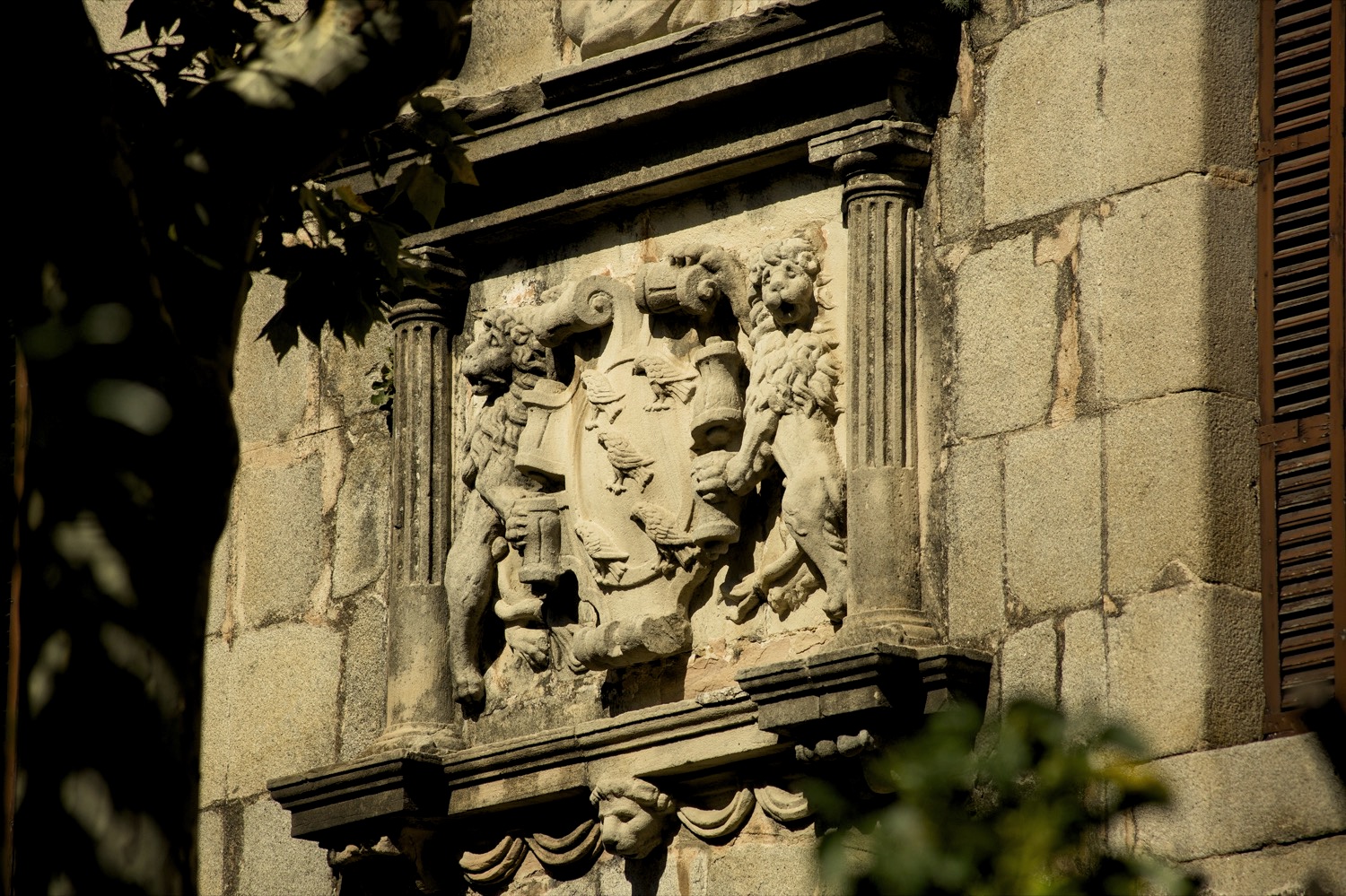 Tot l’edifici és de paredat, amb detalls de pedra granítica de la comarca —tallada amb gran precisió— que s’ha mantingut pràcticament intacta. A la porta principal, les grans dovelles emmarquen un escut heràldic amb cinc corbs entre dos lleons i la data fundacional: 1558. A l’interior, es conserva una sala noble amb sostre artesonat i pintures murals que representen els mesos de l’any i símbols astrològics, una mostra excepcional de l’art renaixentista.